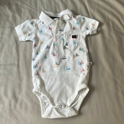 Ett gulligt paket med babykläder i storlek 62-74. Innehåller en tröja med Nalle Puh motiv, en randig tröja, en kofta med knappar, en solhatt, ett par byxor, ett par strumpor och en haklapp.