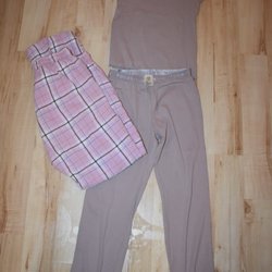 Detta är ett paket med åtta överdelar. I paketet ingår tröjor och långärmade tröjor i olika färger som grå, röd och svart. Några av tröjorna har tryck eller detaljer som stjärnor och rosetter. Det finns även en vit polotröja och en svart cardigan. En jul tröja 134/140 oC en grå 140 annars 146/152
