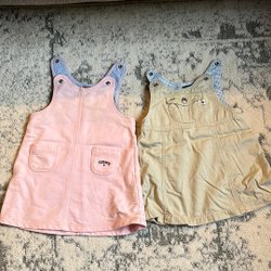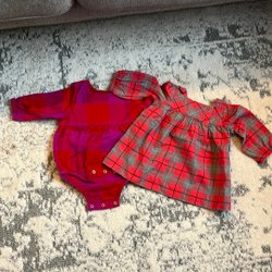 Ett set med två söta babyplagg. En röd blommig body med lång ärm och en rutig klänning med lång ärm och spetsdetaljer.