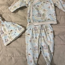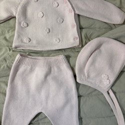Ett set med babykläder. Inkluderar en teddyoverall med dragkedja i storlek 56 från Rikiki, två sparkdräkter med björnar (en från Newbie och en från Åhlens) och en matchande mössa. Använda på en bebis bara, så fint skick!