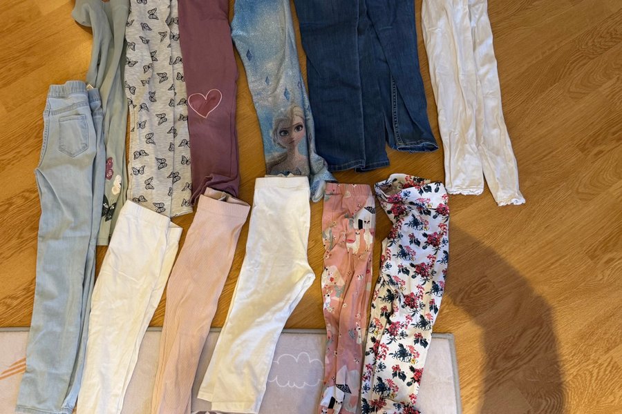 Säljer byxor i mycket fint skick. På ett par av de vita och rosa leggingsen kan det finnas en mycket liten fläck, knappt märkbar. I övrigt är alla i jättefint skick.