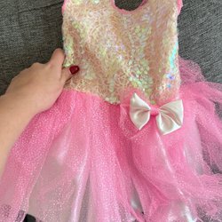 Detta är ett klädpaket med olika barnkläder. I paketet ingår en gul t-shirt med paljetter, en röd skjorta med långa ärmar, en svart hoodie med tryck och ett par svarta byxor. Dessutom ingår en svart fleecejacka med dragkedja.