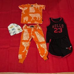 Ett klädpaket med blandade barnkläder och märken. Innehåller t-shirts, långärmade tröjor, byxor, en fleecejacka och en regnjacka.