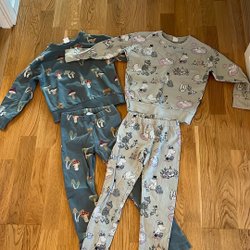 Ett set med kläder i matchande färger och mönster. Setet innehåller en långärmad tröja med volangdetaljer och ett par byxor med blommigt tryck. Det finns även ett annat set med en långärmad tröja och byxor med ett annat blommigt mönster.