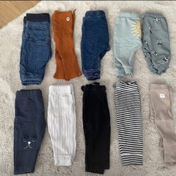 Ett paket med diverse byxor i olika färger och modeller. Innehåller både jeans Pojkbyxor finns i storlek 122/128-128/134-134/140