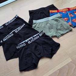 Här är ett paket med kalsonger i olika färger och mönster. Bland annat Björn Borg, Gant, Batman och Hero. 12 st storlek 122/128