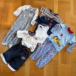 Här är ett paket med barnkläder och tillbehör. Inkluderar en overall med enhörningar, som är i väldigt bra skick.