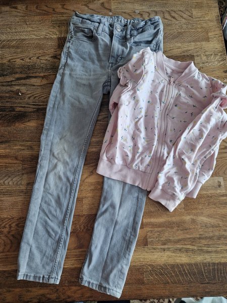 Fint set med ett par grå jeans och en rosa jacka med blommigt mönster. Jackan har dragkedja fram.