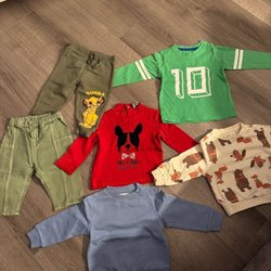 Ett paket med blandade barnkläder. Inkluderar en grön tröja med snögubbe motiv, en brun stickad kofta med knappar och armbågslappar, en svart hoodie och ett par röda fodrade tight.