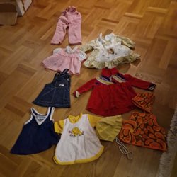 Ett parti med barnkläder. Partiet innehåller bland annat tröjor, klänningar, koftor och jackor. Kläderna har olika mönster och färger.