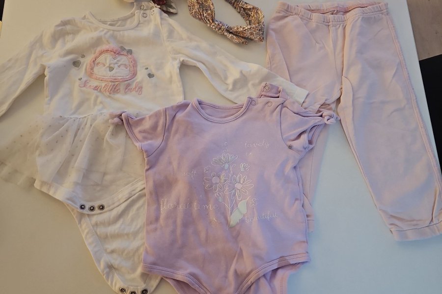 Söt babyset i fina pastellfärger! Setet innehåller en vit body med söt ugglemönster, en lila body med blommigt tryck, ett par lila byxor och två söta hårband. Perfekt för en liten flicka.