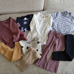 Strl 98. I fint använt skick. 2 st Tjocktröjor, en långärmad tröja. 11 par byxor.