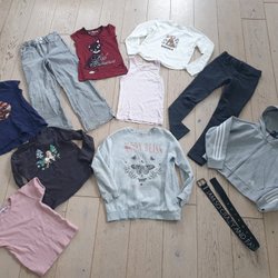 Ett paket med flera barnkläder. Paketet innehåller en pyjamas med dragkedja, hängselbyxor i jeans med gröna detaljee. En vit kortärmad body med hjärtan i olika färger, en gul klänning med volang nedtill och ett hjärta framtill, samt en rosa body med blommigt mönster och långa ärmar.