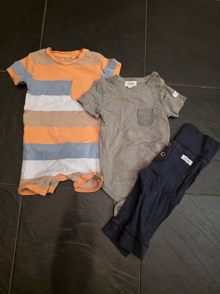 Ett set med tre babyplagg. Inkluderar en randig sommaroverall med korta ärmar och en ficka (Name It), en gråmelerad t-shirt body med korta ärmar och en ficka (Newbie), samt ett par mörkblå byxor med hög midja och dekorativa knappar (Newbie).