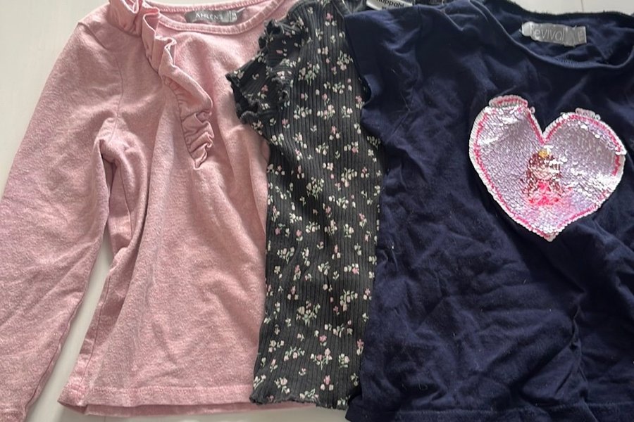 Parti med tre toppar för barn. En rosa långärmad topp med volangdetaljer, en mörkgrå kortärmad topp med blommigt mönster och en mörkblå kortärmad topp med ett hjärta i paljetter.