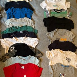 Ett stort parti med barnkläder, inklusive jackor, byxor, tröjor och skor. Kläderna är i olika färger och stilar, lämpliga för olika väderförhållanden.