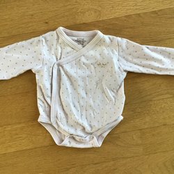 Grå pyjamas tröja och byxor från POP. 122/128. Båda plaggen har ett randigt mönster i grått, vitt, lila, blått och orange. Byxorna har justerbar resår i midjan. Ena ärmmudd är lagad, se närbild. I övrigt bra skick.