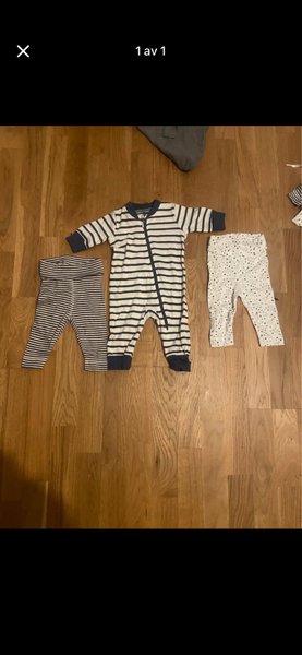 Ett set med en randig pyjamas med dragkedja och två par byxor. Ett par är randiga och det andra paret är vita med små mönster.