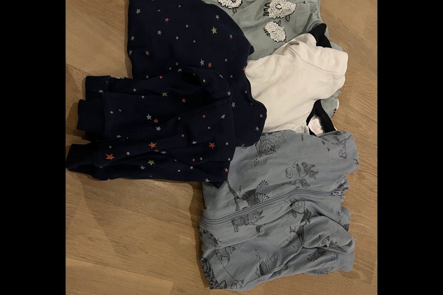 Pyjamaspaket bestående av 4 pyjamaser i storlek 62. Det inkluderar en vit pyjamas med blå detaljer från H&M, en tvådelad pyjamas i blått med stjärnor från H&M, en gråblå pyjamas med djungelmotiv från Newbie samt en grön pyjamas med får från Lindex.