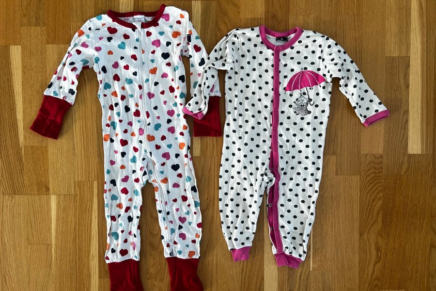 Den ena pyjamasen är vit med ett mönster av olikfärgade hjärtan och har röda muddar samt dragkedja framtill. Polarn o pyret. Strl 92