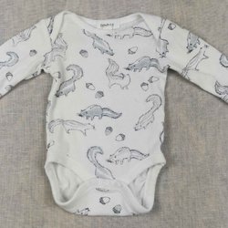 Säljer en långärmad body som är vit i färgen och har blommor över hela plagget.