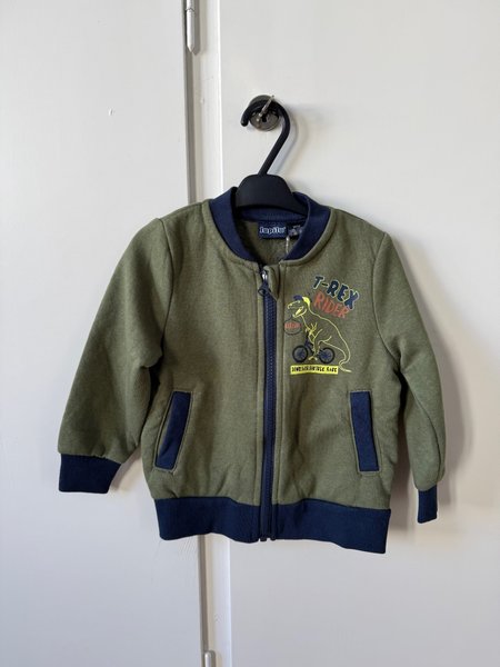 Grön jacka med dragkedja framtill och muddar i hals, ärmslut och nederkant. Jackan har en tryckt bild av en T-Rex som cyklar och texten ”T-Rex Rider” samt ”Dinosaur Bicycle Race”. Det finns även två fickor fram.