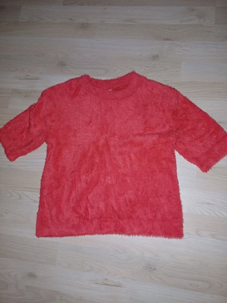 Röd tröja med korta ärmar och rund halsringning.