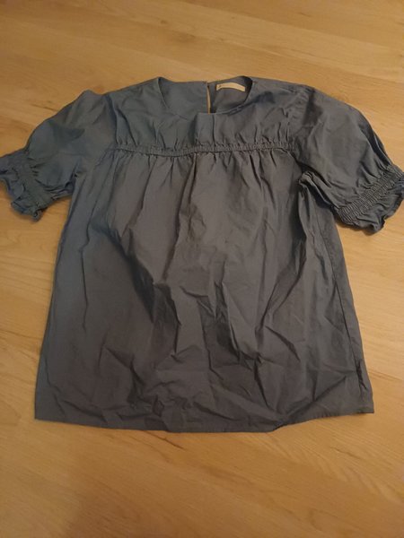 En blå topp med korta ärmar. Toppen har en rund halsringning och rynkade detaljer vid bysten och ärmsluten. Den har en lös passform. Stl 152-158