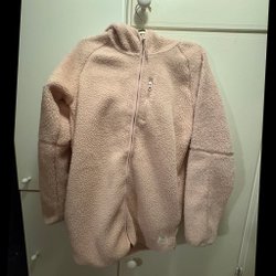 En rosa huvtröja med dragkedja framtill. Tröjan har en huva och ribbade muddar vid ärmslut och nederkant. Den är en praktisk och bekväm tröja som passar bra för vardagsbruk.