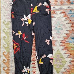 Blommig klänning med smock och puffärmar. Klänningen har en rosa bakgrundsfärg med ett blommigt mönster i gult och orange. Den har en avslappnad passform och en kjol i två lager.