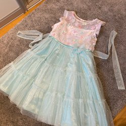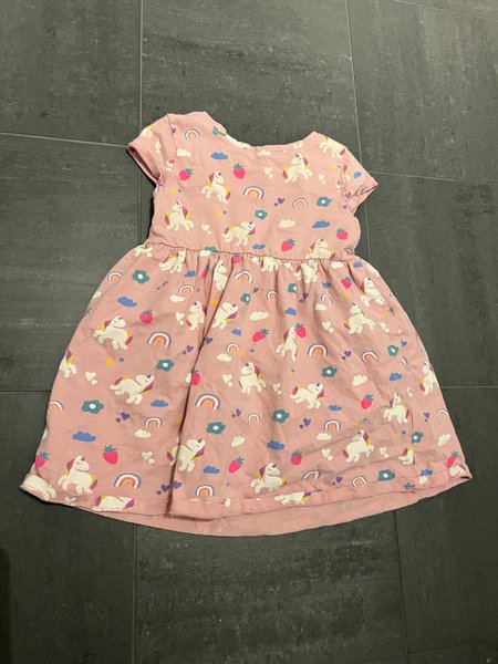 Söt, rosa klänning med ett mönster av enhörningar, regnbågar, jordgubbar, moln och hjärtan.