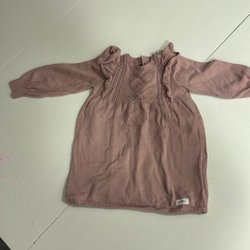 Söt rosa klänning med broderier runt halsen och små tofsar nedtill. Klänningen har knytband i sidorna 40 cm lång