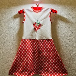 Klänning med jordgubbsmönster och en stor röd rosett framtill. Klänningen har korta, volangprydda ärmar och en rund halsringning. Mönstret består av röda jordgubbar och små hjärtan på en vit, ribbad bakgrund.