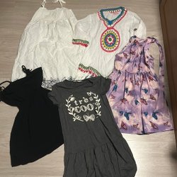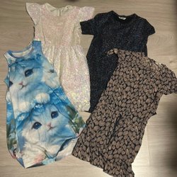 Ett paket med fem klänningar för barn. Inkluderar en grå klänning med huva, en röd klänning med en rosett, en mörkblå klänning med trycket 'Love', en svart klänning med en enhörning och en röd klänning med Chip och Dale tryck.strl 122/128