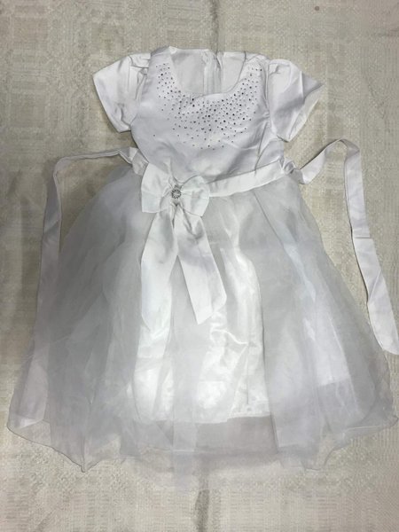 Vit flickklänning med kort ärm och tyllkjol. Klänningen har en rund halsringning med dekorativa stenar. Midjan är markerad med ett vitt sidenband som knyts i en rosett framtill. Klänningen har ett elegant och festligt utseende.