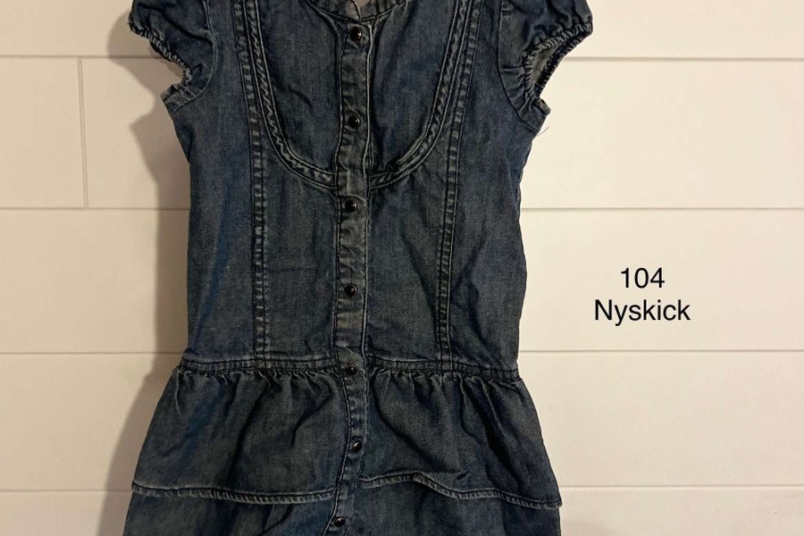 Söt jeansklänning med knappar framtill och volang nedtill. Kortärmad modell med krage.