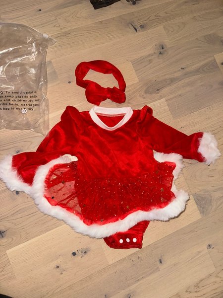 Söt röd juldräkt med vit kant och matchande hårband. Klänningen har en fin kjol med stjärnor. Supersöt röd klänning med långa ärmar, vit fuskpäls vid ärmslut och kjolkant samt glittrig tyllkjol med stjärnor. Medföljer matchande röd rosett att ha i håret. Perfekt för julens alla tillfällen!2-6 mån