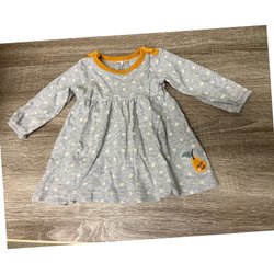 En söt, grå stickad klänning med ett intrikat hålmönster på kjolen. Klänningen har korta ärmar och en knappdetalj i nacken.