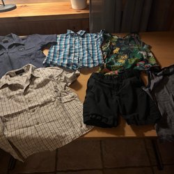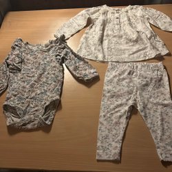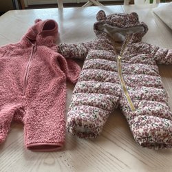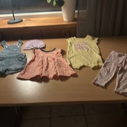 Den övre delen är en blå jeansklänning med volanger vid ärmhålen och knappar framtill stl 68Den nedre delen är en blå och vitrandig med korta ärmar och rynkad halsringning. Stl 62