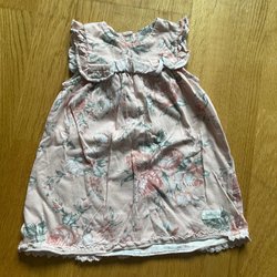 Söt rosa klänning med långa ärmar och ett blommigt mönster. Klänningen har en krage och en rynkad kjol i två lager.