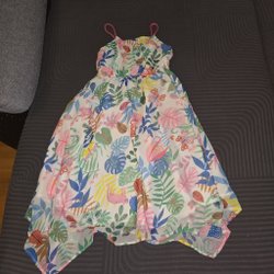 Klänning med ett livfullt fjärilsmönster i olika färger som gult, blått och orange. Klänningen har en rund halsringning och är ärmlös. Nederkanten av klänningen pryds av ett dekorativt mönster med små blommor och fjärilar. Klänningen är designad för att vara bekväm och lekfull, perfekt för varma dagar eller festliga tillfällen.