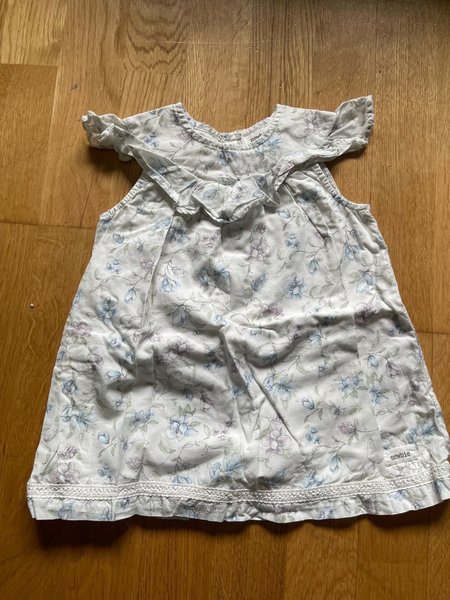 Vit klänning med blommor och volangdetaljer från Newbie. Klänningen har ett blommigt mönster i blått och lila.