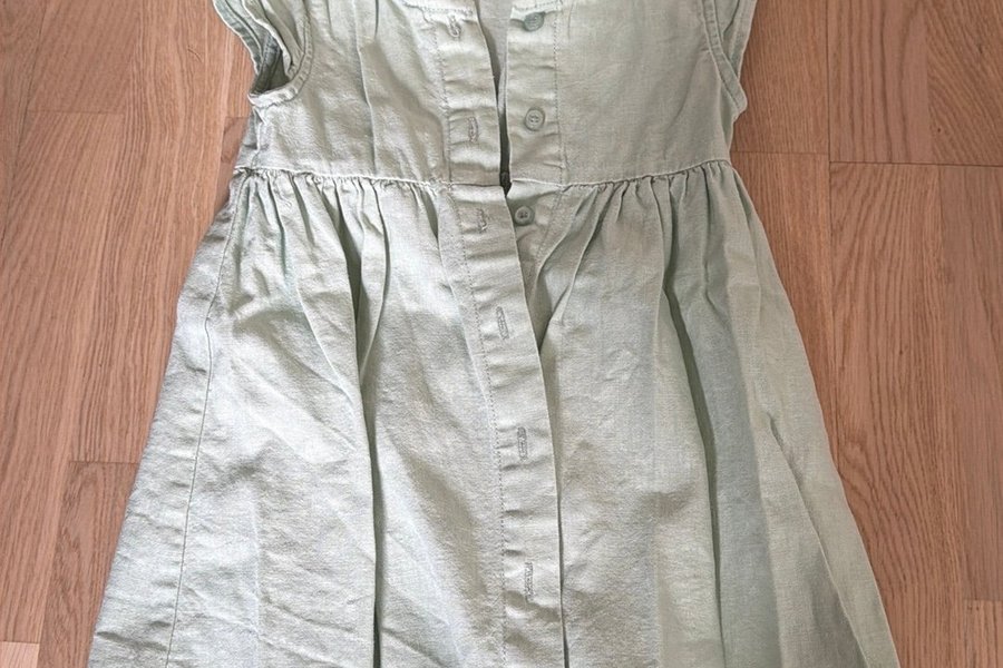 En ljusgrön klänning med knappar framtill och korta ärmar. Klänningen har en rundad halsringning och en markerad midja med rynkad kjoldel.