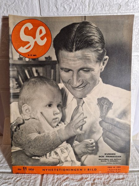 Tidningen Se från 9-15 mars 1950. Reportage om Kungen och Prinsessan, Mora-Nisse och dottern Karin, 8 månader.