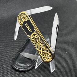 Mycket fin kvalitet på denna fickkniv med läderfodral från J.A. Henckels i Solingen. Skaften med vackert guillocherat mönster. Bestyckad med två knivblad och dubbelsidig nagelfil med fin spänst.