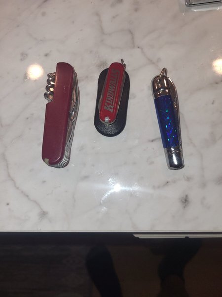 Tre fickknivar. En röd, en Kindwalls och en blå. Tandpetare saknas på swiss army konferens den större på bilden