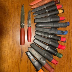 Kniven med blått handtag är nog en Mora kopia.