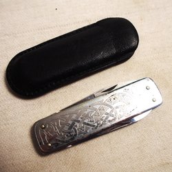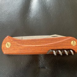 Med trähandtag. Knivbladet är märkt EKA Sweden. Knivens längd ihopfälld är ca 10,5 cm.