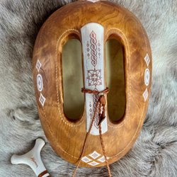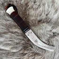 Samekniv av Lars Kuhmune. Kniv i masur och renhorn med ett kolstålsblad. Graverad slida i horn och garvat läder.