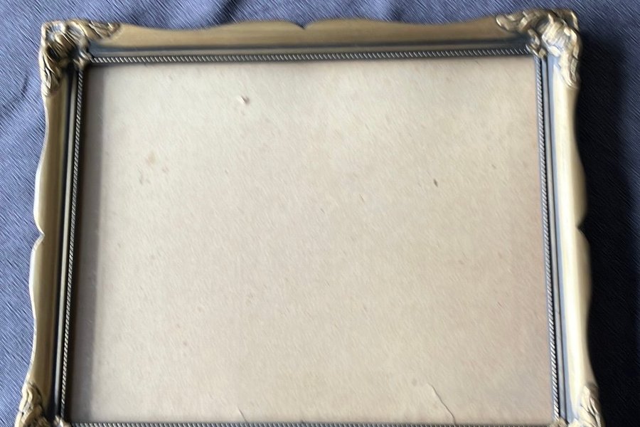 En guldram med detaljerade hörn. Ramen har en rektangulär form med vågiga kanter. 33x27 cm